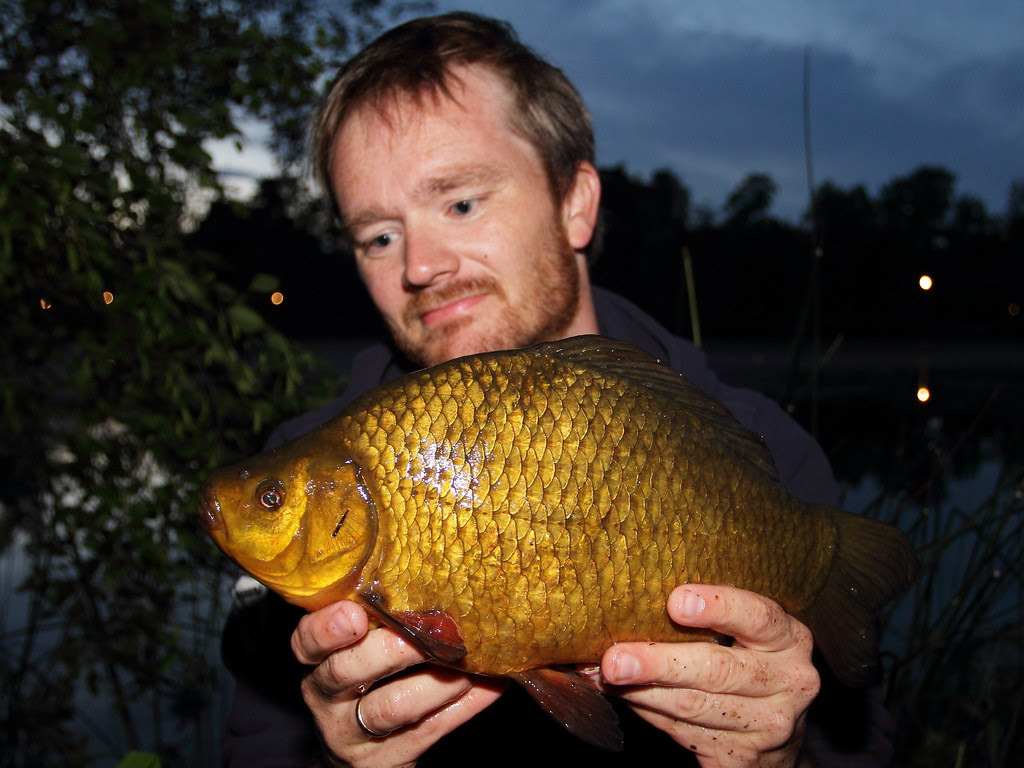 Vel på plass blåste det kattunger og sothøns, og den foretrukne swimmen måtte gis opp grunnet for høy sjø. Jeg lessa på med utstyr og fant meg en lun liten plass på andre sida av vannet. Det er jo selvsagt et lite nederlag, men jeg rigga to boltrig-stenger agnet med plastmais og fikk ut disse. Jeg fikk så agnet opp tolverkroken under duppen, og fikk ut den stanga jeg aller helst ville at fisken skulle ta på. Jeg fikk planta ræva i stolen, fylt kaffekoppen og begynte stirringa. Jeg stirra lenge. Meldingene jeg fikk gikk ut på at det var på dagtid det skjedde. Så fort det var blitt mørkt kunne jeg legge inn årene og pakke meg tilbake dit jeg kom fra. Det skjedde nada i dagslys. Fortvilelsen økte for hver time som gikk mot det etter sigende steindøde mørket, og jeg prøvde alle triks i boka. Fiska i forskjellige vannlag, forsøkte meg på litt stalking og rev av meg luehåret. Ingen fisk. Ingenting. Til slutt begynte det plutselig å skje litt på swimmen min. rulling, bobling og klare tegn på fisk gjorde at jeg fikk litt trua igjen. Jeg rigga duppen tilbaken til min foretrukne overblya tilstand og kasta den ut der det bobla som verst. Det gikk kanskje ti sekunder før duppen begynte å bevege seg sidelengs. Tilslaget ble satt i hysterisk panikk, og fisken svarte tungt i andre enden. Jeg hoia og skrek, og jeg tipper store deler av Vestfold hørte jubelropet mitt da karussen endelig lå i håven. Den lille gjengen turgåere rett bak meg fikk i alle fall valuta for pengene. Klapping, glis og tommel opp fra hele gjengen. Jeg innser nå at jeg burde ha snudd meg og bukka, men det er jo lett å si i ettertid. De fikk nøye seg med et glis.